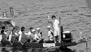 这次是北京奥运圣火全球首次以龙舟的方式在香港城门河进行传递,香港著名游泳运动员施幸余高举奥运火炬立于传递火炬的龙舟船头(如图),1200米水程,历时9分钟。