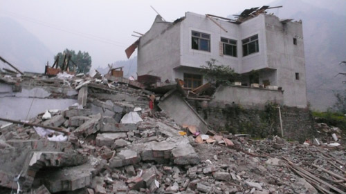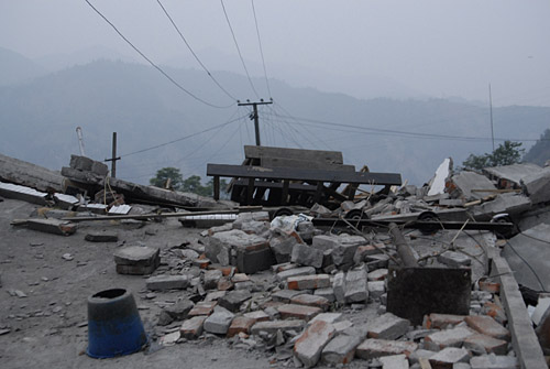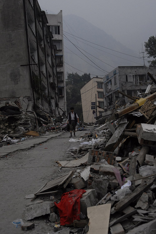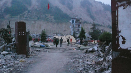 我们徒步进入映秀时,路还未能承受大量救援车辆进入 首先映入眼帘的就是映秀镇的漩口中学 这里是距离震中最近、震度最强烈的地方 但是在这里我们没有看到昨天和前天目睹的那几所学校所遭受的粉碎性坍塌 这里的学生大多数都生还,伤亡比例较小 教学楼在最严重的摧残下还可以辨认出的其框架结构的样子 看上去教室的整体框架还比较完整,但它的一层已被彻底掩埋