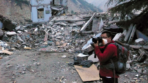这些孩子们和老师们你们还好吗?  这座宿舍楼的一层也被彻底震垮 虽然破损严重,漩口中学的宿舍楼并没被强烈地震彻底撕碎 但是通往映秀中心小学的路上我们看到震魔的肆虐 项目组汪延在映秀的残墙断壁间向受灾小学行进 临时的家 无法辨认的家园 映秀小学大门,整个学校已被夷为平地 受灾的映秀小学只有旗杆和教学楼的一角依然耸立 废墟下还埋着两百多个孩子和二十多名教师 从15日起,负责久远的山东消防官兵还在努力搜寻生命的迹象 17日晚20:00经仪器确认,废墟下还有生命 救援官兵抓住一线生机决不放弃 四十四岁的谭国强校长,不想说话,只惦记干活。连续六个昼夜,他都没有离开映秀小学 谭校长一直在试图启动这量汽车,想为救援运送药品 两位母亲焦急地期盼着能有奇迹眷顾她们的孩子, 她们的两个女儿一个在四年级、一个在二年级 体育刘老师也一直在救灾现场 为他们祈祷平安 17日,夜幕已经降临,映秀城里几处有生命迹象的废墟上,官兵还在搜救 留守的当地人正在焚烧散落在废墟上的衣物 |