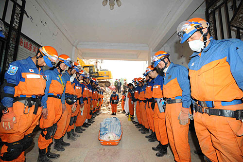 月17日,日本搜救人员向遇难者遗体默哀。当日7时25分,日本救援人员历经16个小时的搜救,在四川青川县乔庄镇一处倒塌的六层楼房废墟中挖出两具遇难者遗体。 新华社记者 李涛摄