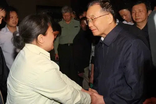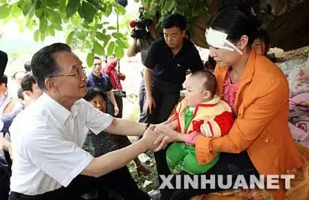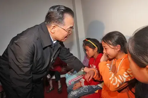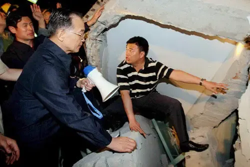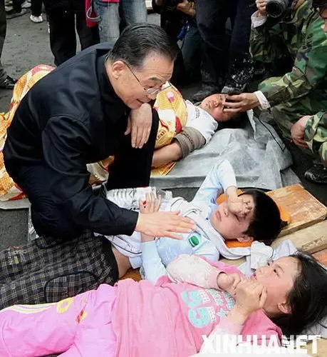 5月13日,温家宝总理在四川都江堰市新建小学察看灾情,当他看到抢险人员正在解救两名被困在废墟下的孩子时,激动地流下了热泪。在雨中,温家宝蹲坐在废墟上对着孩子说,我是温家宝爷爷,孩子们一定要挺住,一定会得救!