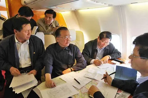 北京时间5月12日14时28分,四川汶川县发生7.8级地震,中共中央政治局常委、国务院总理温家宝赶往地震灾区,指挥抗震救灾工作。这是温家宝在专机上研究布置抗震救灾工作。