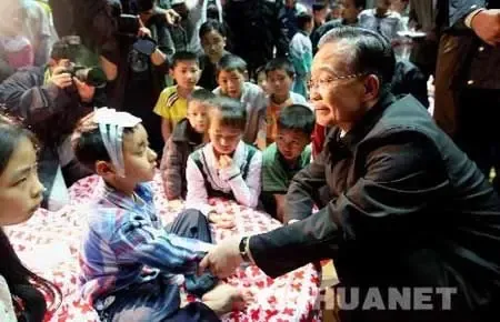 不眠不休的温家宝依然步伐快捷地穿梭于抢救现场、避震人群、幸存孩童中间,他不停地为灾民传递着勇气和信心。
