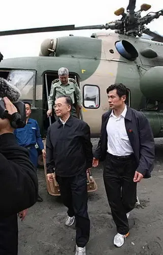 5月14日下午,中共中央政治局常委、国务院总理温家宝乘军用直升机抵达汶川映秀镇察看灾情。 新华社记者 姚大伟 摄