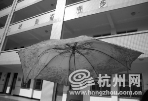 教学楼下是水泥地,一把淡红色的雨伞扔在地上,是收拢的。打开,看到骨架都生锈了,有几根骨架已经断了。抬头看了一下,二楼窗台到地面,起码有四米。