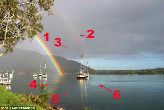 人们几乎看不清楚第六道彩虹,但是考利博士坚持称,如果你认真看,你就能看到第六道彩虹。他说:“诺拉的照相机只拍到了第六道彩虹(图示6)的部分,它是河面的一次反射,雨滴内的两次反射形成的。由于进行了多次反射,其颜色被扩散出去,它的外貌仅依稀可见。”