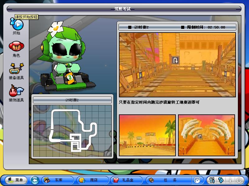 五:计时赛;在指定时间内跑完沙漠旋转工地,限制时间为2分50。最终的考试,采用了现在难度比较高的沙漠旋转工地作为考试用图,想要在规定的时间里跑完,必须要对漂移的路线,能量的积累和使用以及加速时机的把握有充分的计划,还要对这张地图有足够的熟悉和了解,最后一关也是最为关键的一关,千万不要功亏一篑哦!