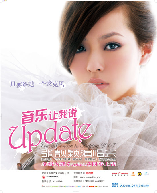 新浪娱乐讯 继去年成功发行首张专辑《The One》及首唱会之后,今年张靓颖(听歌,blog)再接再厉,将于7月28日推出其第二张大碟《Update》,并于当天在北京展览馆举行由诺基亚全程支持的“音乐让我说Update张靓颖演唱会”。而今天,由两岸三地顶级造型师共同打造的最新形象新鲜出炉,其中特别为靓颖订制的一套名曰“梦幻公主”白色纱裙秀的演唱会海报也首次曝光公众面前。
