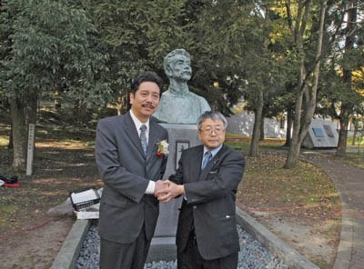 中国前国家主席和夫人王冶坪女士1998年11月29日访问仙台,向鲁迅纪念碑献花之后,在碑前栽种一棵