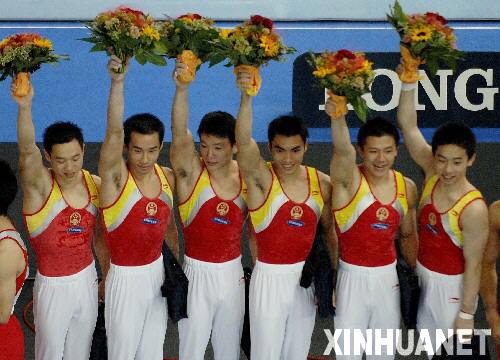 当地时间9月6日,2007年体操世锦赛男团决赛在德国斯图加特保时捷体育馆结束。经过异常激烈的争夺,中国队以281.900分战胜日本队(277.025分),成功卫冕团体金牌,德国队以273.525分获得铜牌。此次胜利,是中国队体操世锦赛男团的三连冠,同时也是中国男子体操队第八次获得世锦赛男子团体冠军。